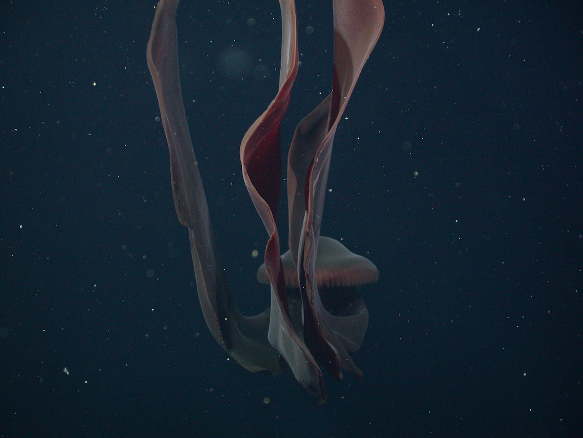 Billowing mauve sleeves emerging from a glowing red bell, Medusa’s arms remind me of Mami Wata’s translucent flesh, a soft yet menacing invitation to be consumed, and perhaps rewarded for your devotion. And yet, sheltered by Medusa’s voluminous folds, Thalassobathia pelagica, pelagic brotula, finds nourishment and protection in a deep sea predator. In fact, their relationship is one of the first documented symbiotic relationships of ophidiiformes (cusk-eels, brotulas, pearlfishes, etc.): in exchange for food and shelter, pelagic brotula removes parasites from Medusa. Even when separated, the two species find their way back to each other, due to the low frequency vibrations Medusa emits. Seafloor, as much a graveyard as it is a womb.